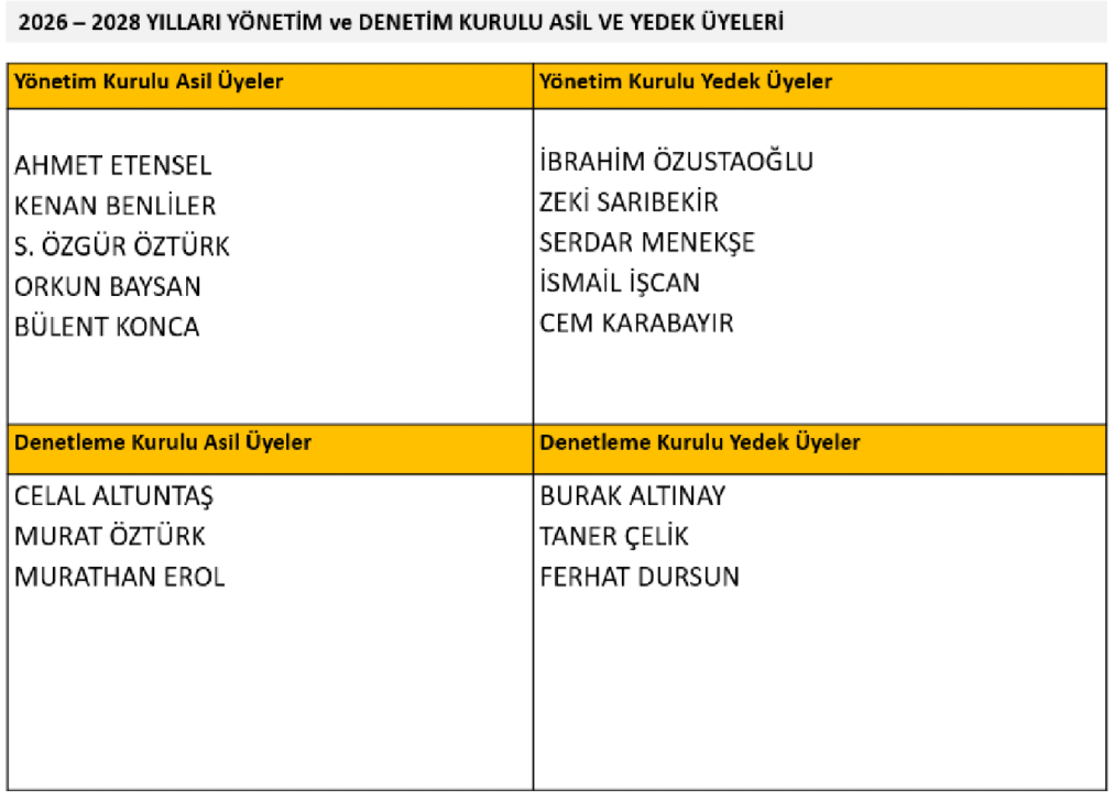 2 Mart 2026 tarihinde gerçekleşen Olağan Genel Kurulumuz ile birlikte 2026-2028 dönemi için Yönetim Kurulu Asil ve Yedek üyelerimiz ile Denetim Kurulu Asil ve Yedek üyelerimiz belirlendi.